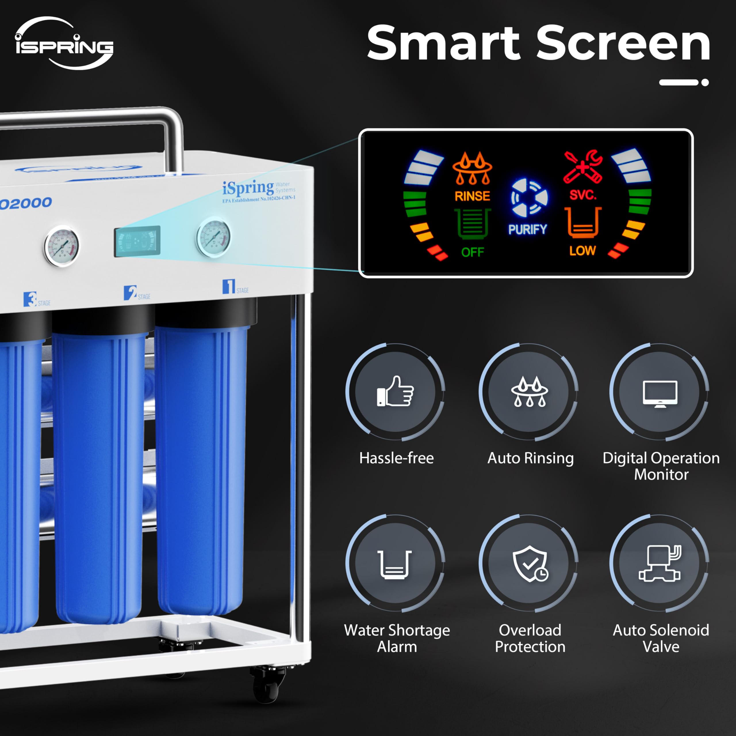 iSpring CRO2000 4-Stage Tankless Commercial Reverse Osmosis Drinking Water Filtration System w/Dual Pumps, Pressure Gauges, and Freestanding Stainless Steel Bracket, 2000 GPD—