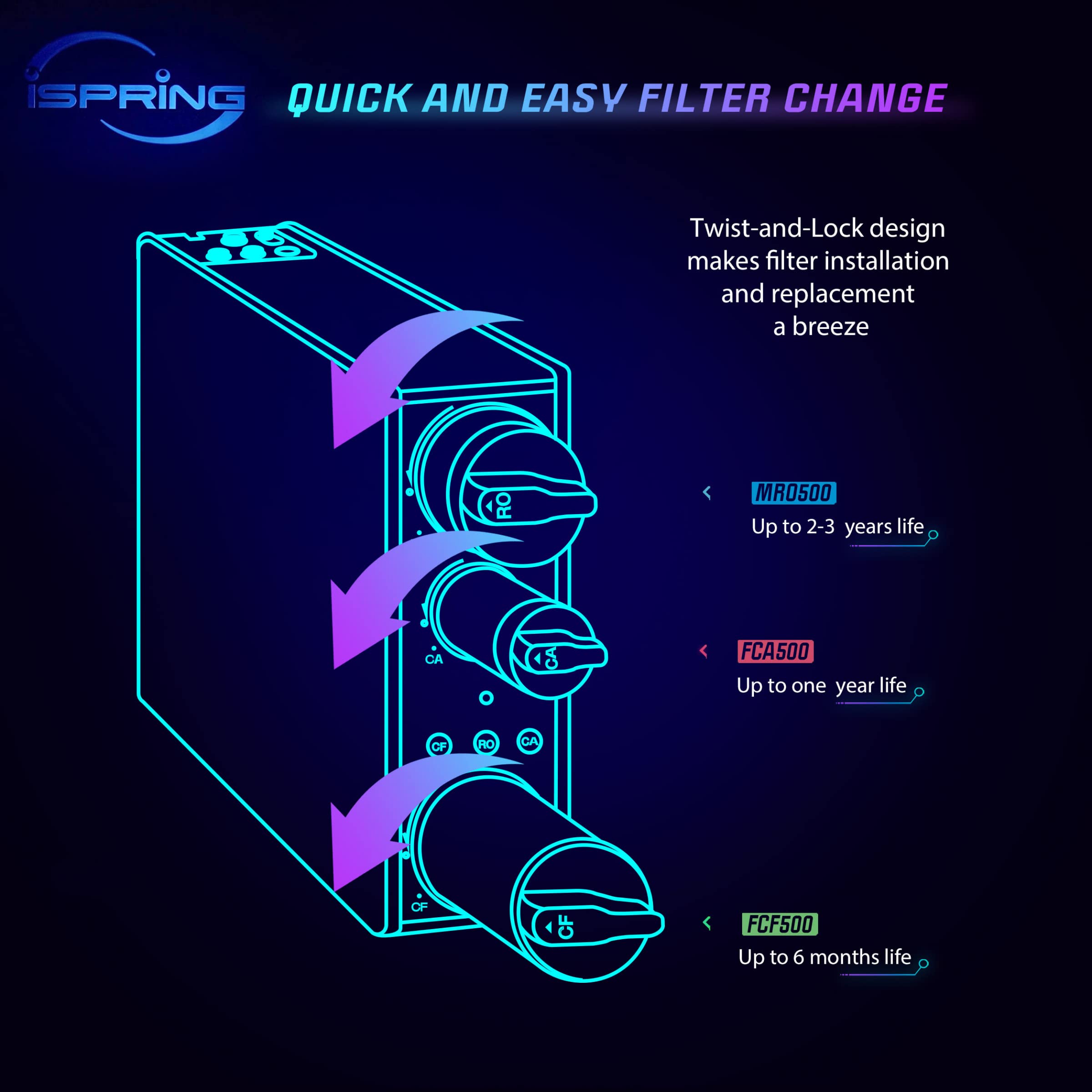 - Dedicated final stage carbon alkaline composite filter replacement cartridge for iSpring RO500 series tankless reverse osmosis system. Quick and easy filter change. No tools required.