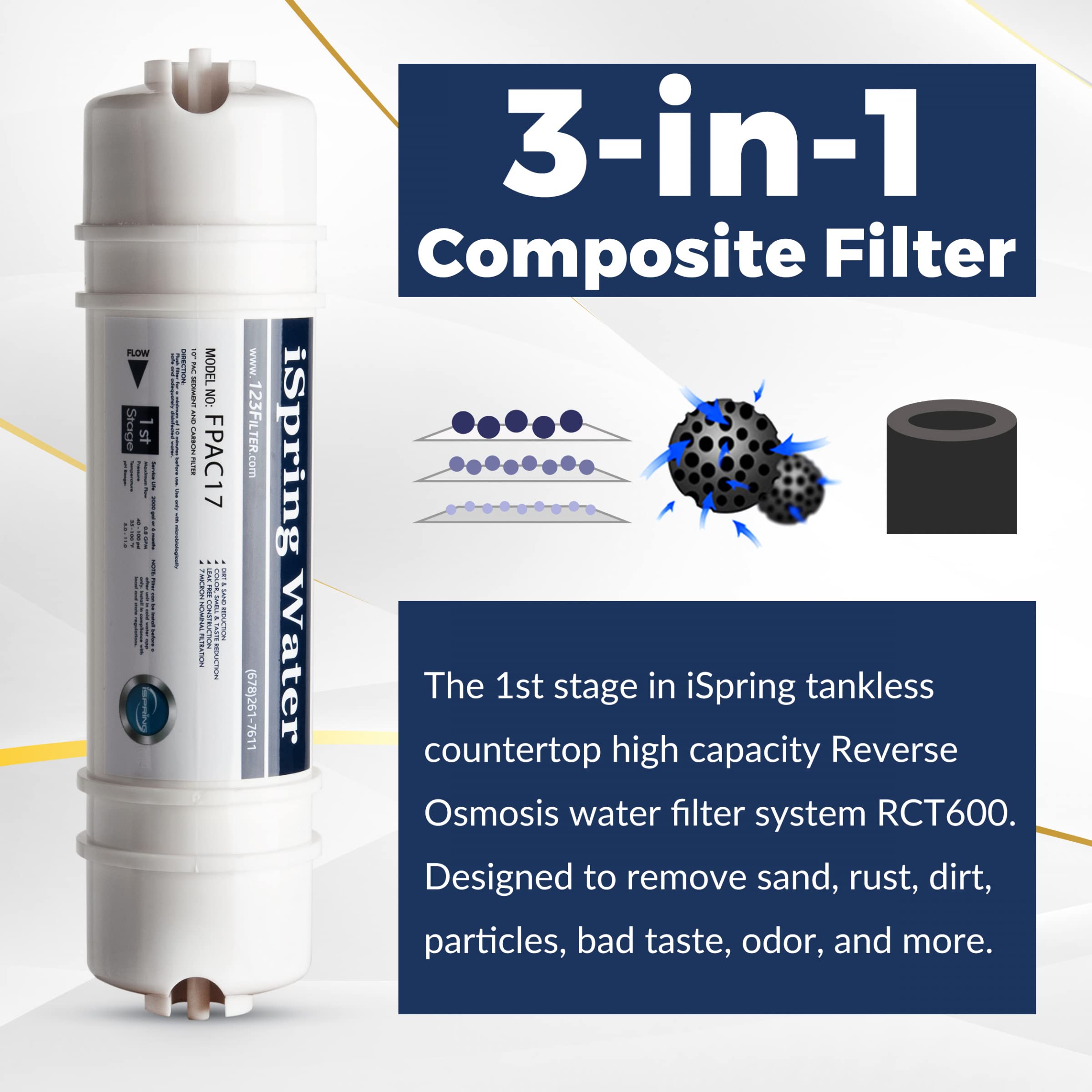 - Dedicated 1st stage replacement filter for iSpring countertop RO water filter system RCT600. Comes before 600 GPD RO membrane MC600 and 3rd stage post carbon filter FT15B. Experience clean and fresh water every time you turn on your drinking water faucet.