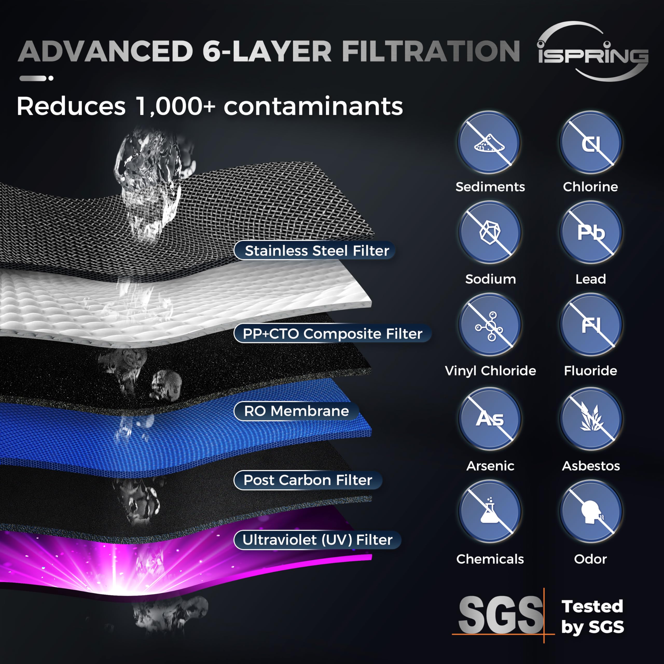 - [Most Impurities Reduction] - As iSpring’s next-generation countertop Reverse Osmosis water filtration system, it reduces up to 99% of over 1,000 harmful contaminants like vinyl chloride, chlorine, fluoride, lead, arsenic, PFAS, asbestos, calcium, sodium and more. This ensures access to fresh and filtered drinking water. The Reverse Osmosis water filtration system countertop features a built-in UV light, providing added protection. Please note: this RO system is intended for city water, not well water.