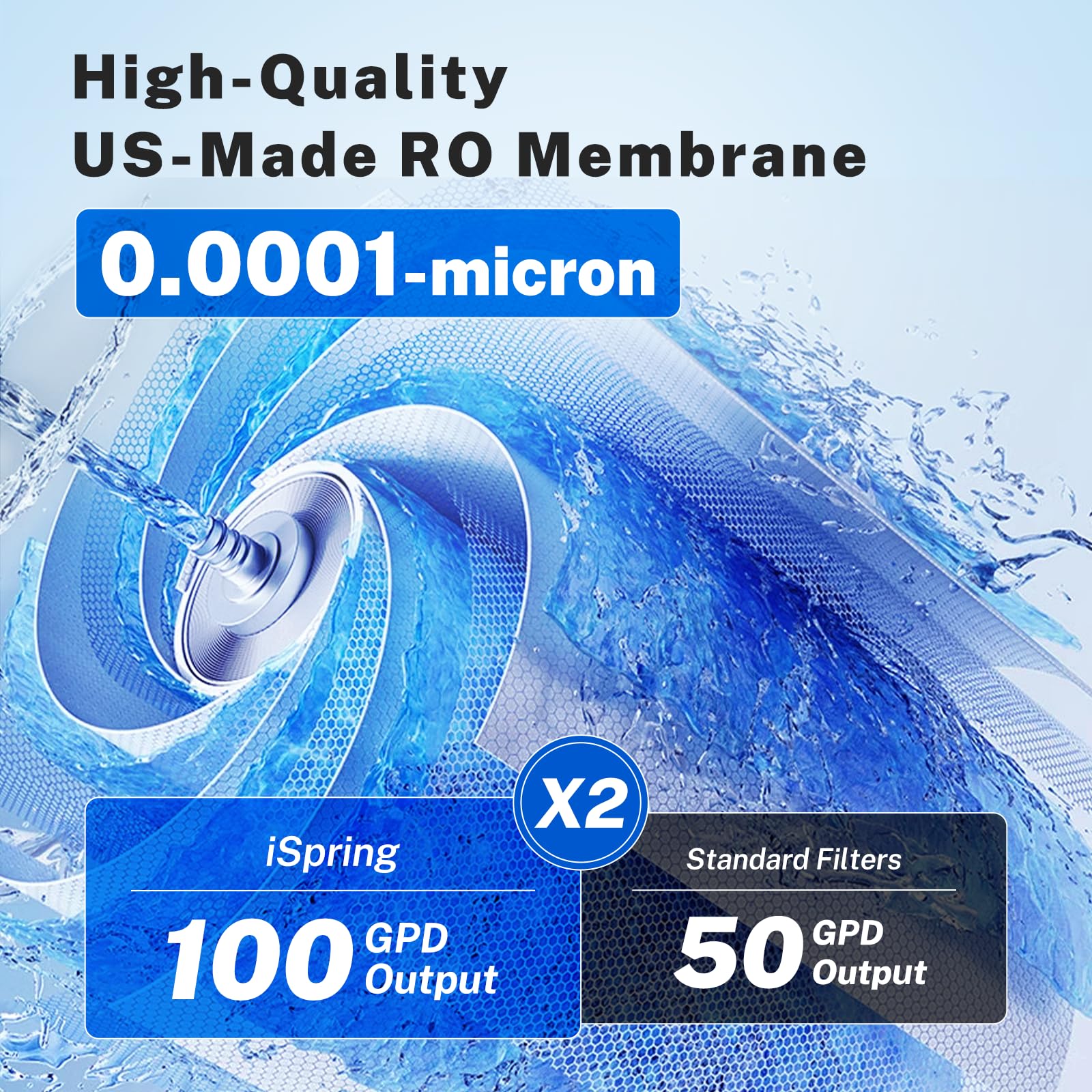 iSpring RO100 Under Sink 5-Stage Reverse Osmosis Drinking Water Filtration System High Capacity 100 GPD Fast Flow, 1:1 Pure to Waste Ratio, US Made Filters